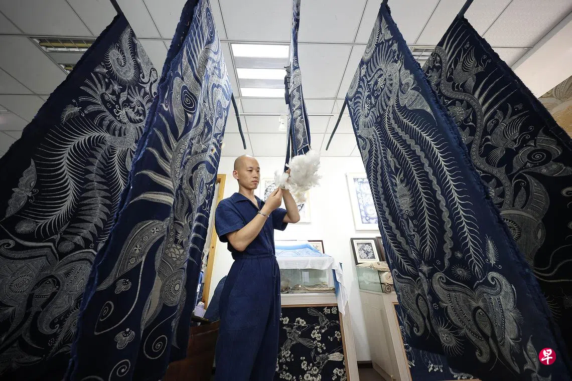 8月10日,在贵州省黔东南苗族侗族自治州丹寨县宁航蜡染工坊,成昊在整理蜡染制品。42岁的哈尔滨人成昊在一次偶然的机会首次近距离接触到苗族蜡染这项国家级非遗技艺,萌生了将现代时装设计与传统蜡染纹样相结合制作时装的想法。2017年,成昊来到苗族蜡染主要传承地贵州省丹寨县,就此沉浸在了蜡染的世界,蜡染工坊的画娘们都戏称他为“蜡染工坊小裁缝”。几年中,成昊设计的蜡染时装不仅在丹寨传统“蜡染圈”产生了不小的影响,还登上了北京国际时装周、伦敦时装周等国内外十几个时尚秀场。(新华社)