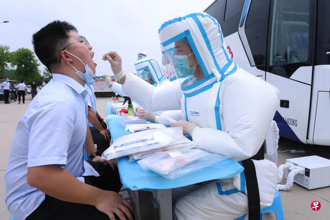 由河南驼人集团研制的一款智能控温医用正压防护服,日前受到关注,在炎炎夏日为医护人员送去清凉,被称为“空调防护服”。该款防护服的研发始于2020年初,目前已迭代4次,主要由防护衣、送风系统(含过滤装置)和智能控温系统组成,实现了环绕式循环均匀送风,内部温度可控制在26至29摄氏度之间。穿戴者不必用护目镜,头部可自由活动,解决了传统防护服的诸多问题。图为河南新乡长垣市妇幼保健院医护人员,8月19日身着“空调防护服”为民众做核酸检测取样。(新华社)