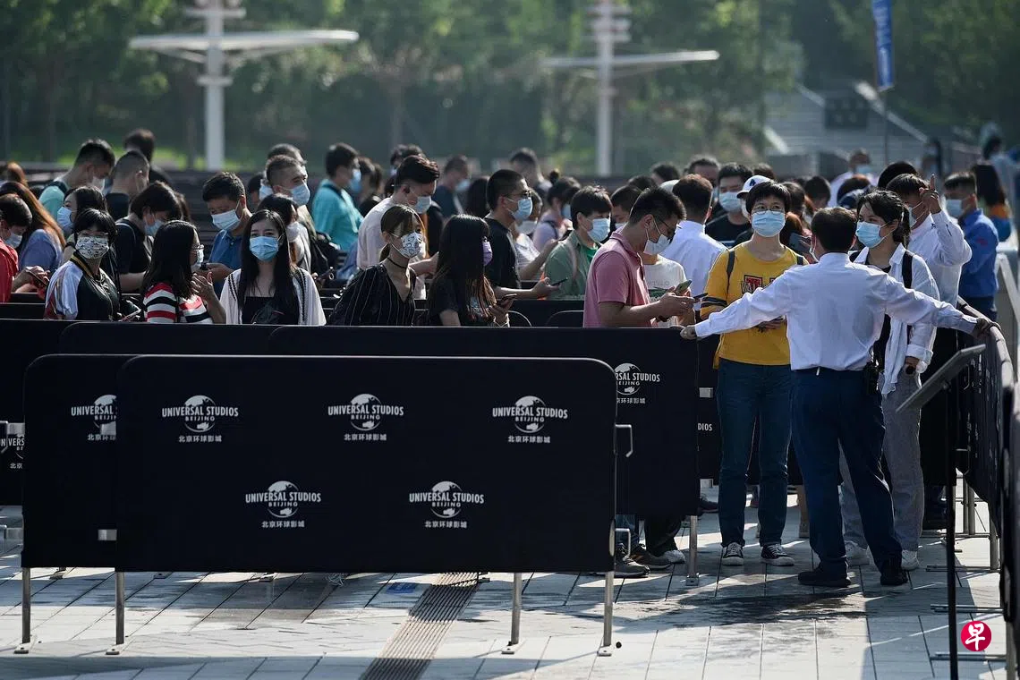9月20日正式开幕的北京环球影城度假区昨天开始试运行,试运行期间仅向受邀客人开放,由于一票难求,不少黄牛票贩借机倒票,目前试运行门票已经遭爆炒至一张3000元人民币(625新元),甚至有人转票开价至5000元人民币。图为昨天排队入场的游客。(法新社)
