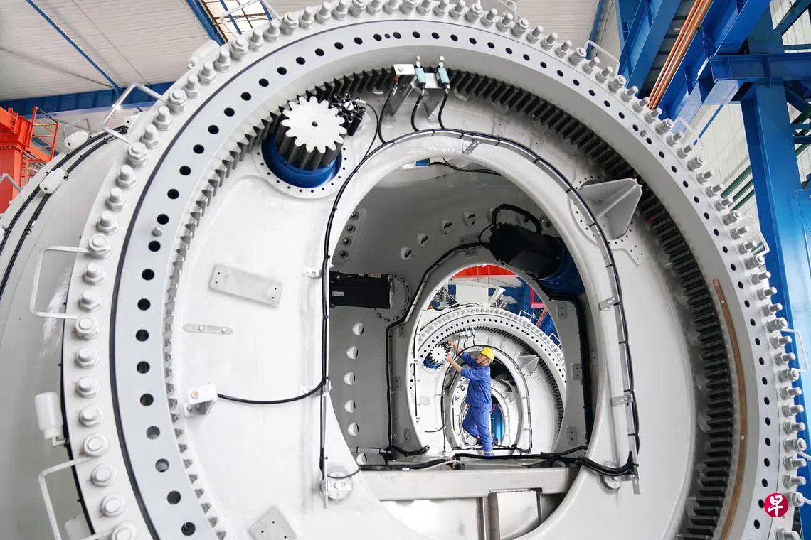 黑龙江齐齐哈尔一名工人在风电装备生产制造厂的生产车间工作。(新华社)