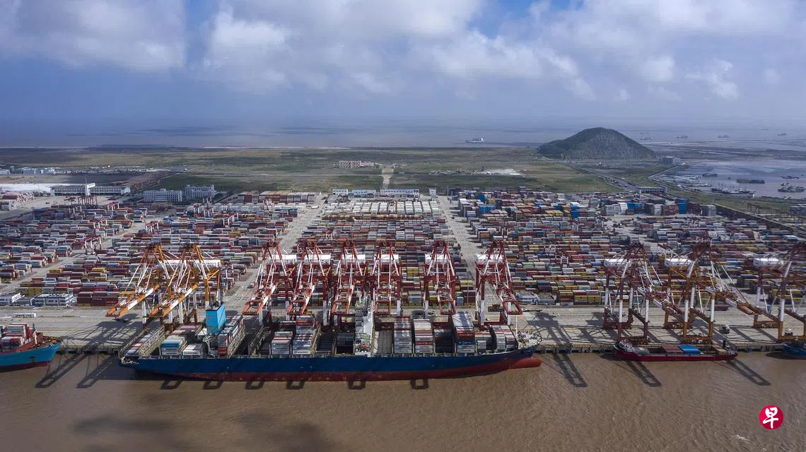 中国海关总署统计分析司司长李魁文昨天(10月13日)说,前三季度中国进口规模创历史同期新高,与2019年同期相比增长22%,主要大宗商品进口价格上涨,部分消费品进口增长较快。据海关统计,前三季度进口12.78万亿元(人民币,下同,2.69万亿新元),增长22.6%,与2019年同期相比增长22%。中国强大的国内市场为创造全球总需求作出了贡献。图为前天的上海洋山港的深水港。(彭博社)