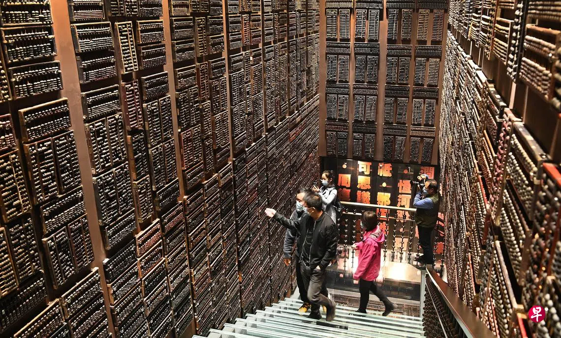 中国算盘博物馆位于陕西省榆林市榆阳区夫子庙文化旅游街区,建设总投资约人民币4000万元(838万新元),布展面积约2100平米,展陈算盘9999件,是全中国目前唯一以中国算盘为主题的博物馆。馆内所有算盘藏品从唐代到现代,时间跨度1000多年,材质以金银铜铁、玉骨木瓷为主,形状各异、手工精致,彰显算盘文化厚重的历史底蕴和文化内涵,展示了中国算盘在不同历史时期的生命力和影响力。图为上周末游客在中国算盘博物馆参观。(新华社)