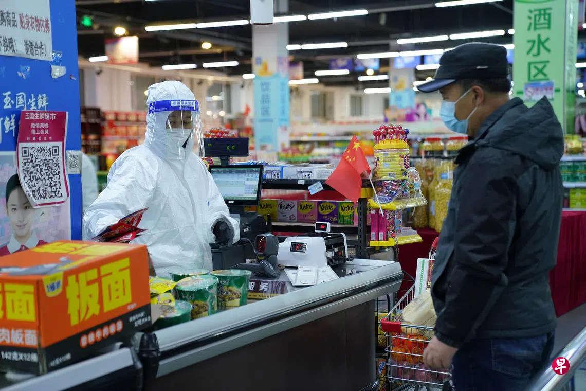 中国大陆截至前天午夜通报新增确诊病例71起,本土病例48起,黑龙江省占了19起,其中黑河市18起、哈尔滨市1起。黑河市现有冠病本土确诊病例54起,疫情防控形势复杂严峻。目前,该市全力保障民众日常生活物资供应,同时启动多轮核酸检测工作,最大程度降低疫情传播和扩散风险。图为一名市民前天在黑河市一家大型超市购买商品。(新华社)
