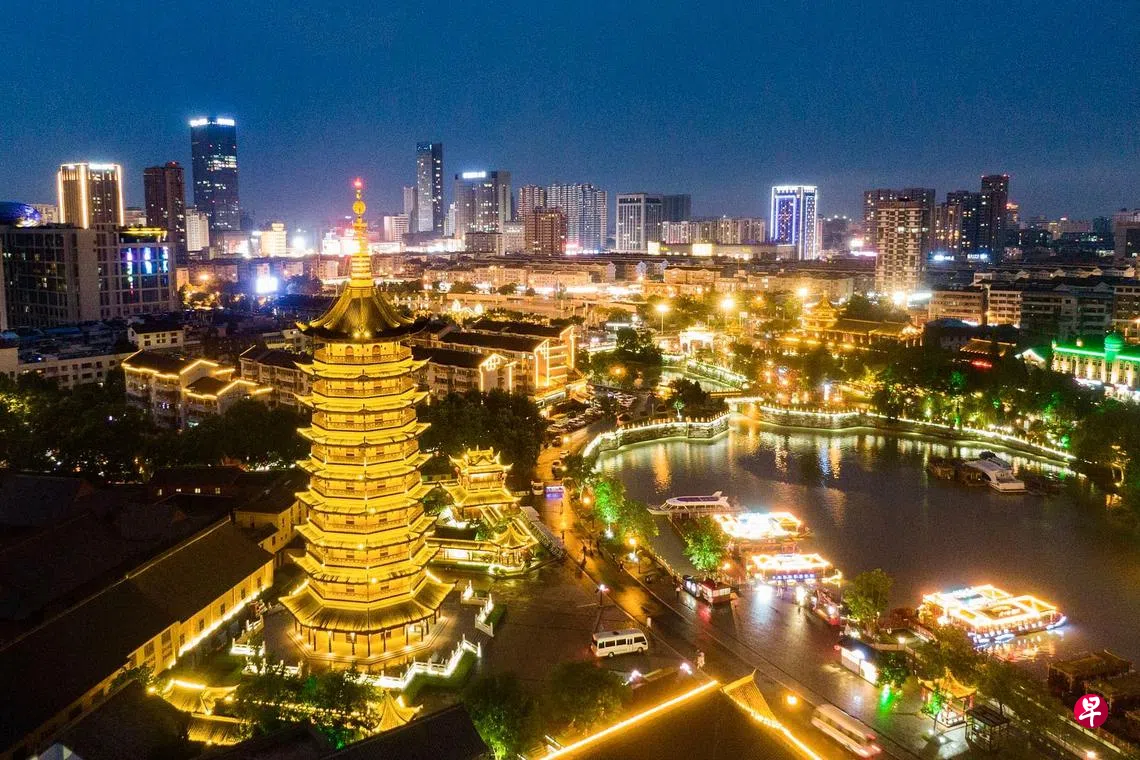 联合国教科文组织在本月8日宣布,江苏淮安当选为“全球创意城市网络——美食之都”,成为继四川成都、广东顺德、澳门、江苏扬州之后,中国第五个入选的城市。至此,淮扬菜的“淮”与“扬”已一同跻身“世界美食之都”行列。图为6月25日拍摄的淮安标志性景点——里运河文化长廊流光溢彩。(香港中通社)