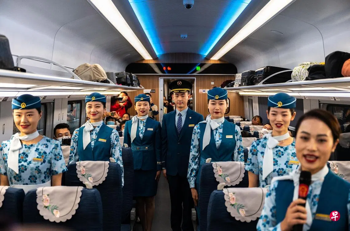 中国铁路昆明局集团有限公司昨天在中老铁路媒体试乘体验列车上,展示昆明客运段以“丝路花语”为主题的列车员制服。制服以“孔雀蓝”为主色调,搭配牡丹花、山茶花等元素。全长1000多公里的中老铁路,北起云南省昆明市,南至老挝首都万象,是中国“一带一路”倡议与老挝“变陆锁国为陆联国”战略对接项目。其中,老挝段北起老中边境口岸磨丁,南至老挝首都万象,全长400多公里。工程于2016年12月开工,计划2021年12月建成通车。(新华社)