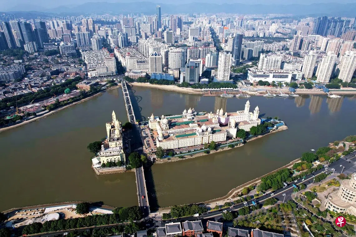 中洲岛是中国福建省会福州市台江区闽江江心的一座岛屿,位于解放大桥一侧。该岛总建筑面积7万平方公尺,曾被誉为“南台明珠”,是“榕城十大景观”之一。岛屿与江岸陆地之间有万寿桥和江南桥连接,其中万寿桥已有600多年历史,是闽江上最古老的石桥。图为昨天从空中鸟瞰位于福州闽江上的中洲岛,宛如一艘在江上行驶的巨轮。(中新社)
