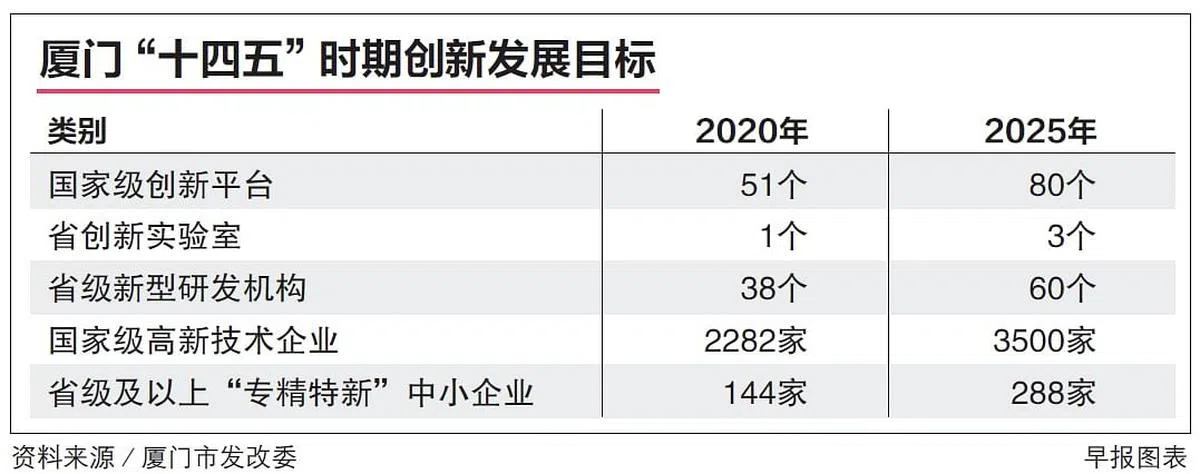 为此,厦门计划在“十四五”期间把研发经费占GDP比重从3%提升到3.5%,建设更多国家级创新平台和研究中心,推动“专精特新”企业数量翻倍增长,将全市的国家级高新技术企业从2282家增至3500家。