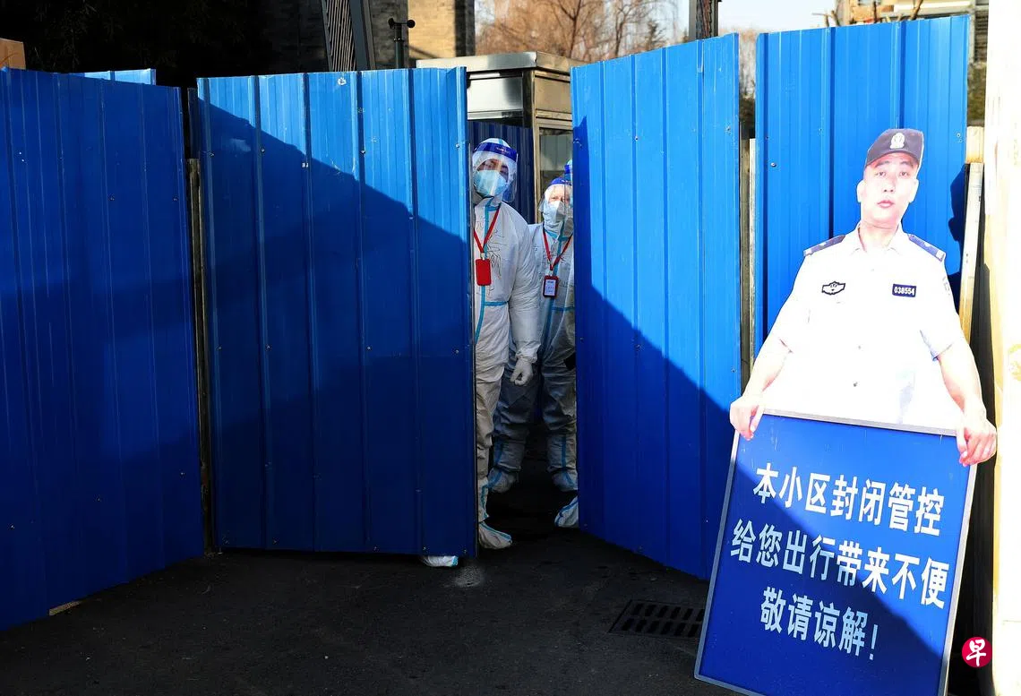 昨天凌晨零时至下午6时,北京新增五例本土核酸检测阳性者。其中四人为同一单位冷库的装卸工,另一人为同住密切接触者,一同从事冷库装卸工作。图为北京本月15日通报第一起奥密克戎变异株冠病确诊病例的病人,其居住的小区已经被封闭管控。两名身穿防护服的工作人员,站在小区门口把关。(路透社)