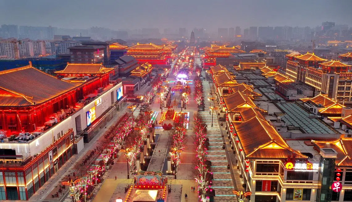 去年10月陕西省会西安市冠病疫情暴发,西安大雁塔景区、大唐不夜城步行街暂停开放。随着疫情逐渐受控,西安市曲江新区、未央区、经开区、浐灞生态区、国际港务区自本月19日起陆续解封,恢复正常生产生活秩序。春节临近,大唐不夜城点亮璀璨夺目的灯光,迎接新春佳节的到来。图为昨天无人机拍摄到的大唐不夜城。(新华社)