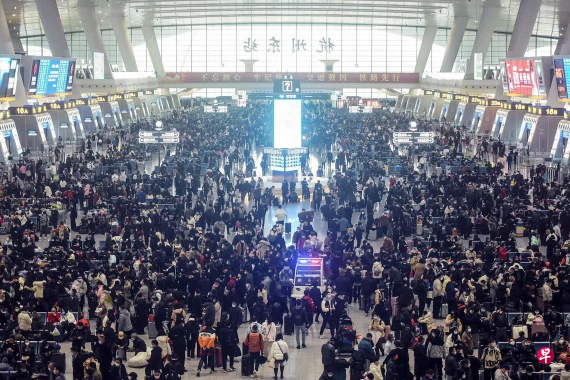 2022年春运进入第九天,杭州东站有大批赶着回乡过年的旅人。中国今年春运从1月17日开始,至2月25日结束。虽然疫情升温,不少省市倡导就地过年,杭州市也推出“就地过年大礼包”让外地打工者每人申领500元(人民币,106新元)抵扣券或现金券,不过,仍有人要赶回家过年。交通部门预计,截至24日,全国预计发送旅客2607万人次,其中铁路预计发送旅客565万人次,公路1920万人次,水路38万人次,民航84万人次,高速公路预计流量2954万辆。整个春运期间,全国发送旅客预计将达到11.8亿人次,同比增长超过三成。(彭博社)