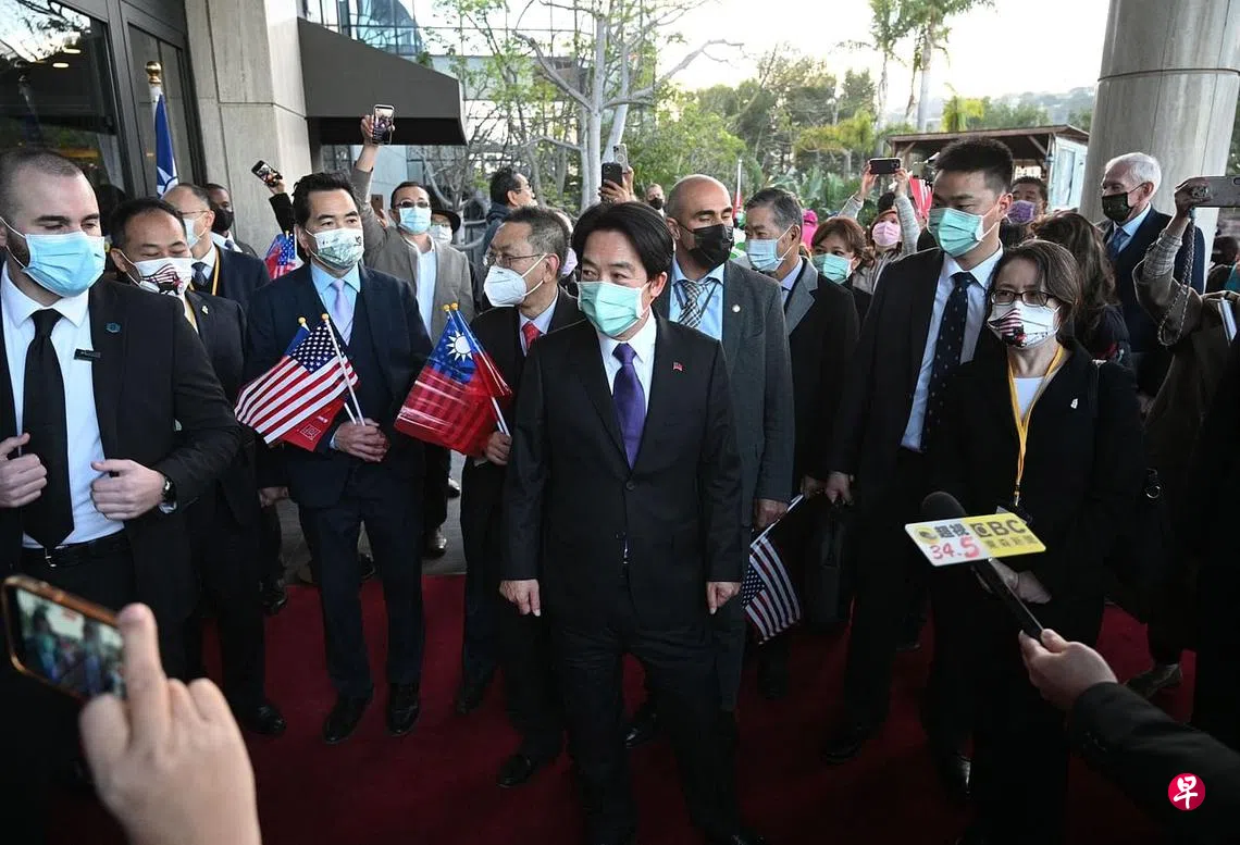 赖清德在美西时间昨天清晨6时许抵达洛杉矶,台湾驻美代表萧美琴和美国在台协会(AIT)主席莫健(James Moriarty)前往接机。上百位台湾侨民顶着10度以下冷冽寒风,戴着口罩在赖清德下榻的饭店外守候,让他相当感动。台侨手上或拿青天白日旗,或举美国国旗,还有人拿着民进党党旗。
