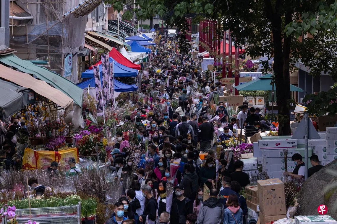 昨天是年廿八,按照香港传统,市民除了大扫除也会在家中布置。但因应冠病疫情反复,香港特区政府取消今年的港岛维多利亚花园的年宵花市,而位于九龙旺角的花墟便成为买花集中地。图为昨天旺角花墟一带好像市宵市场般水洩不通,各花店布满迎春花,行人道及店舖尽是闻花者,甚至延伸至行车路。有市民慨叹今年新年“没事好做”有只买花;有花商预料今年生意会因取消花市而受惠,生意额或上升20%。(彭博社)