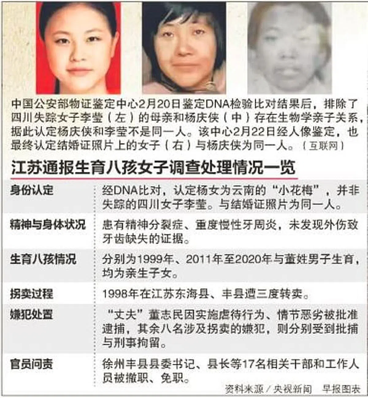 江苏省官方昨天(2月23日)发布“丰县生育八孩女子”最新调查通报,认定主角“杨某侠”(杨庆侠)即为来自云南的“小花梅”,并非失踪的四川女子李莹。徐州丰县县委书记、县长等17名公职人员则遭撤职、免职等处分。学者分析,本案凸显地方基层未能落实执法,而舆论是否能推动正在修订的《妇女权益保障法》进一步完善,值得注意。