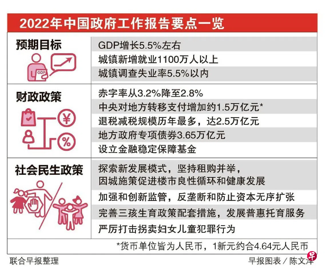 官方将2022年国内生产总值(GDP)增长目标设在5.5%左右,这虽然低于去年“6%以上”的目标,但仍处于市场预期“5%至5.5%”的高位,也高于国际货币基金组织预测的4.8%。