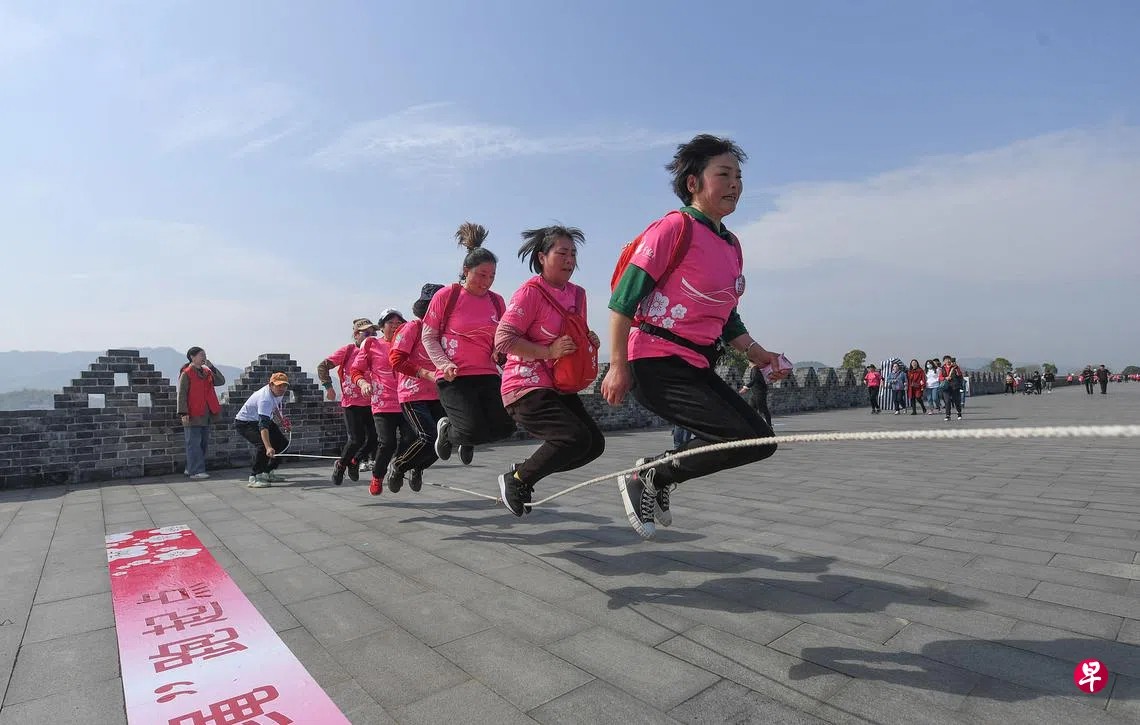 浙江杭州今年9月举行第19届亚洲运动会,该省建德昨天举办迎亚运活动,村民在严州古城城墙上跳绳。(新华社)