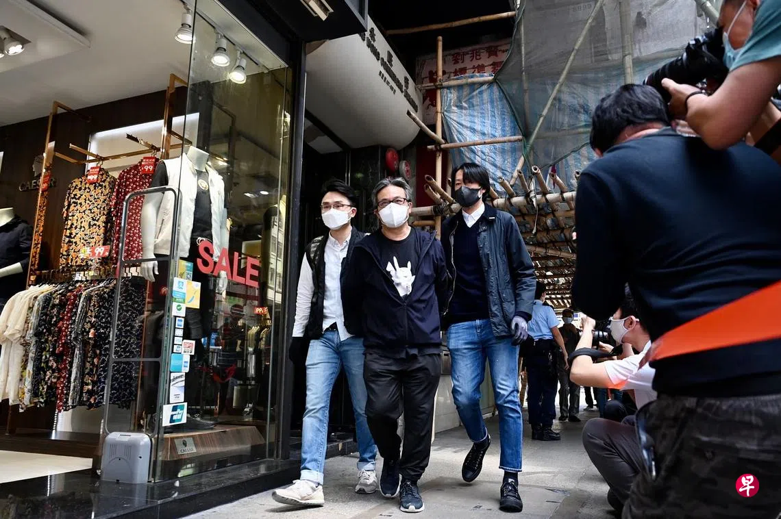 已宣布解散的香港职工盟多名骨干成员因涉嫌违反“社团条例”,昨天被警方国安处上门带走协助调查,在囚的秘书长李卓人也将受查。图为警方昨天完成职工盟旺角会址的调查,并带走职工盟主席黄迺元(左二)。职工盟已于去年9月19日宣布启动解散程序,但至今尚未完成取消社团注册。职工盟被指于1994年至2013年间获得“美国国家民主基金会”旗下劳工组织资助,并多次发起罢工及鼓动非法集会等大规模活动。(中新社)