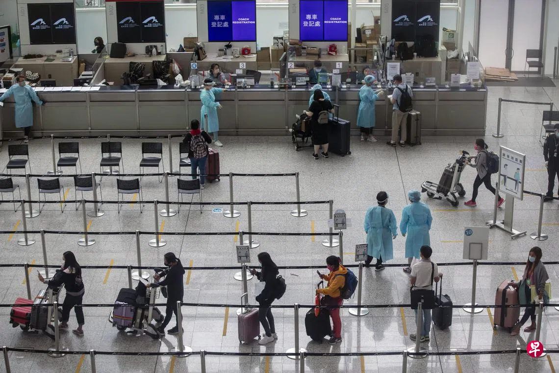 昨天是香港解除九个国家赴港“禁飞令”的第一天,陆续有香港市民从英国、美国、加拿大等地回港。不过九个国家当中,全天只有英国及菲律宾有直航机抵港,来自其他地区的港人需转机回港。有返港市民说,熔断机制令他们很惨,机票、酒店不停更改。有人两星期前选择到泰国逗留14天再回港,形容是为“过冷河”,“因为真是不知要等多久”,额外的旅费用了1万美元(1万3600新元),批评港府将海外回港者“妖魔化”,认为这批返港者十分安全。图为抵达香港的旅客,在抵境大厅登记后被专车直接送到检疫酒店进行隔离。(彭博社)