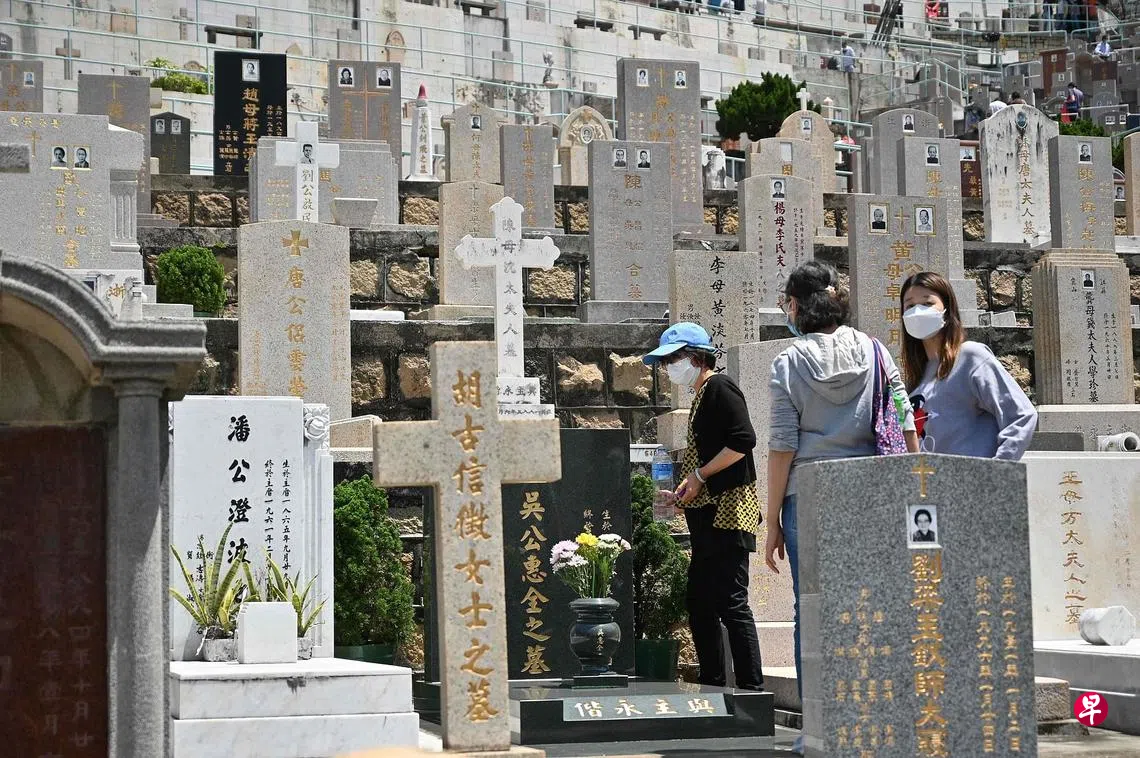 香港华人基督教联会薄扶林道坟场,简称薄扶林华人基督教坟场,位于香港岛薄扶林道119号至125号,范围约为域多利道近沙湾东华义庄以东、薄扶林道以西的山坡。坟场内葬有多位名人,包括昔日香港四大百货公司(先施百货、永安百货、大新百货、新新百货)的家族、著名作家许地山、孙中山中文老师区凤墀、孙中山次女孙婉、女婿戴恩赛、粤语电影《黄飞鸿》中老反派石坚、《信报》投资专栏作家曹仁超等。图为民众在昨天的清明节到薄扶林华人基督教坟场为先人扫墓。(法新社)