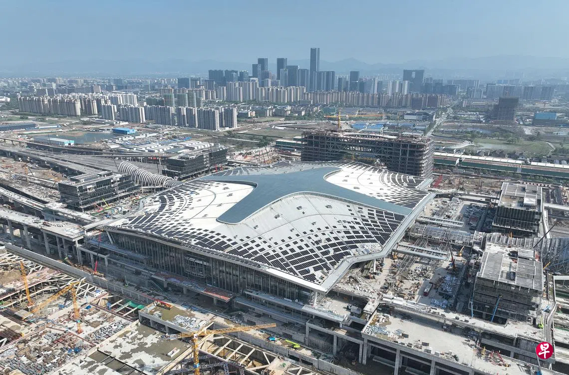 杭州2022年亚运会配套工程杭州西站光伏发电项目面积1万5000平方米,共有7540块400Wp单晶硅光伏组件,采用“自发自用、余电上网”的并网模式。建成后,预计年均发电量达231万度,每年可节约标准煤830余吨,减少二氧化碳排放量2300余吨。图为4月24日航拍的杭州西站屋顶光伏组件。(中新社)