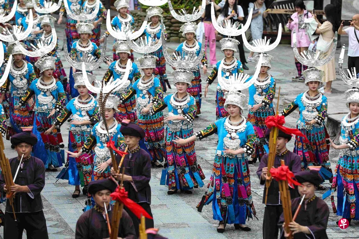 西江千户苗寨、郎德苗寨位于贵州省黔东南苗族侗族自治州雷山县,距离沪昆高铁凯里南站均不到50公里的路程。近年来,当地不断推动高铁资源和旅游景区深度融合,方便各地游客前去体验苗族风情,观赏苗寨美景,为古老苗寨的乡村振兴注入活力。图为昨天在西江千户苗寨景区内,表演者盛装游行。(中新社)