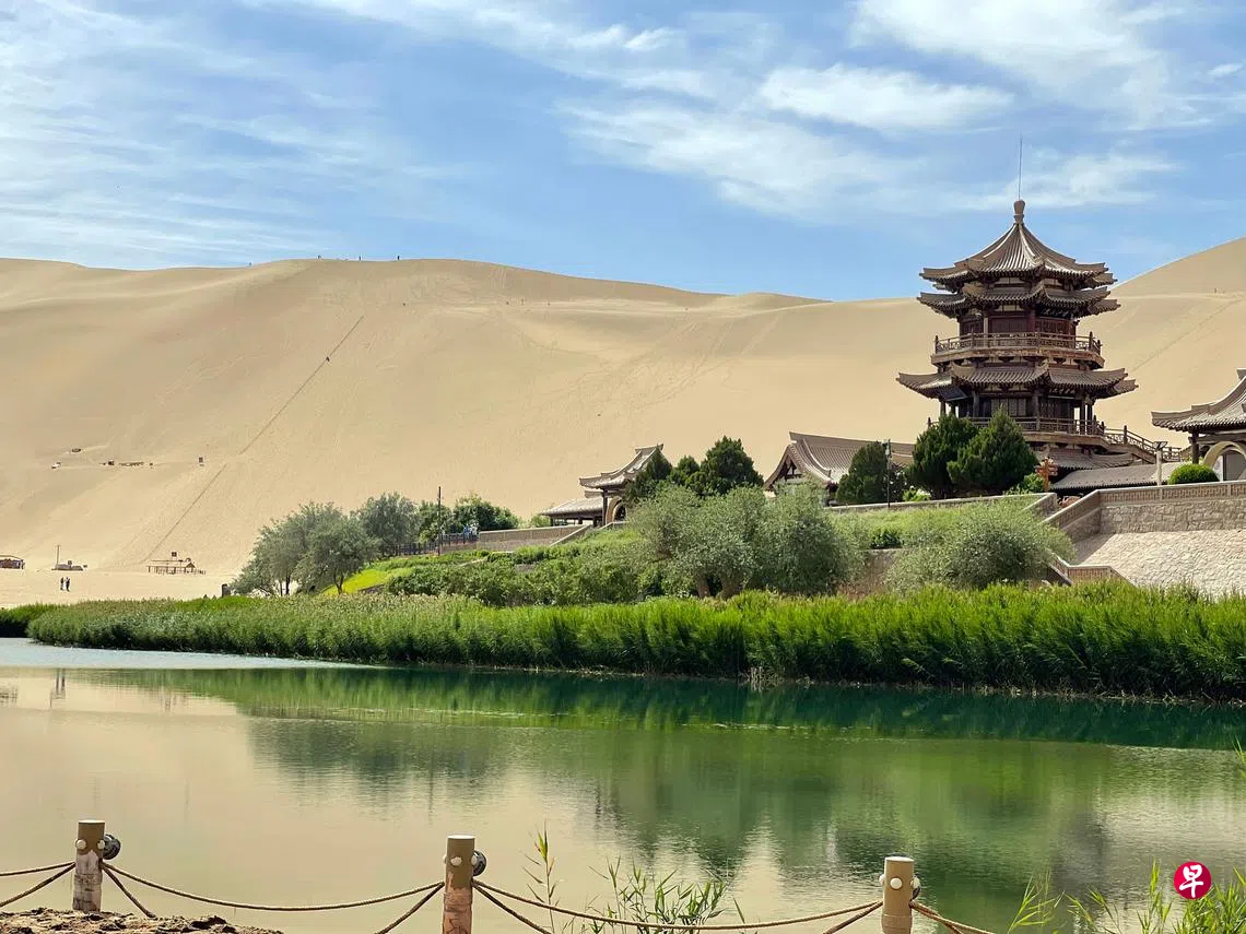 鸣沙山月牙泉风景名胜区是中国国家5A级旅游景区,位于兰州敦煌城南五公里,沙泉共处,妙造天成,古往今来以“沙漠奇观”著称于世。月牙泉处于鸣沙山环抱之中,其形酷似一弯新月而得名。那里水质甘冽,澄清如镜,绵历古今,沙不进泉,水不浊涸。图为6月14日拍摄的鸣沙山月牙泉景区。(新华社)