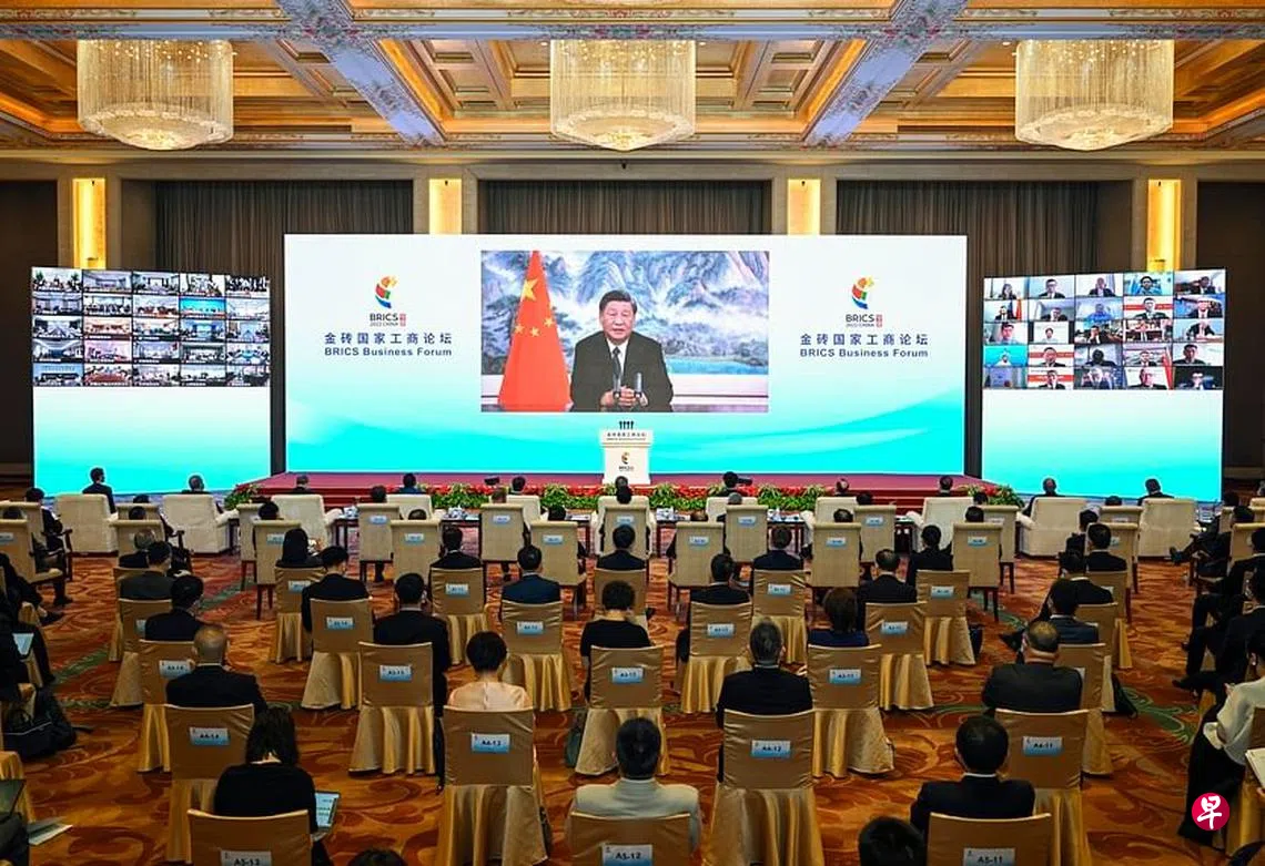 习近平昨晚以视频方式出席在北京举行的金砖国家工商论坛开幕式,并发表主旨演讲,为今天召开的金砖峰会定下基调。
