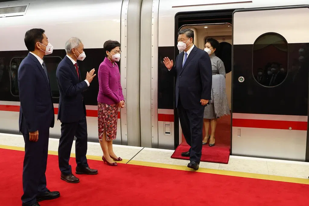 央视新闻画面显示,习近平乘坐的高铁专列昨天下午约3时15分抵达香港西九龙站,港府安排了大批中小学生和工作人员手持红旗、花束,在车站等候。