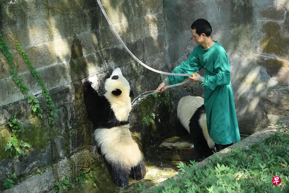夏日炎炎 冲凉消暑重庆近来持续高温天气,当地动物园的工作人员为大熊猫冲凉消暑。(中新社)