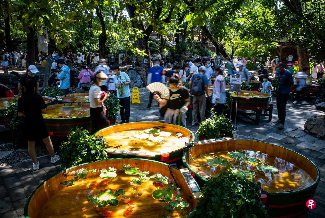 北京恭王府星期四(7月28日)举行“府苑拾趣——2022年宫廷金鱼特展”,展出中国九个省市共40个品种的500余尾金鱼,并让游客通过“木海观鱼”的形式赏鱼。所谓“木海”,即养中国金鱼的一种木制器具,一般只有直径1.5米以上的大木盆才能被称作木海,通常高度35厘米左右,取材比较讲究的是柏木,其次是杉木,多为圆形或椭圆形。