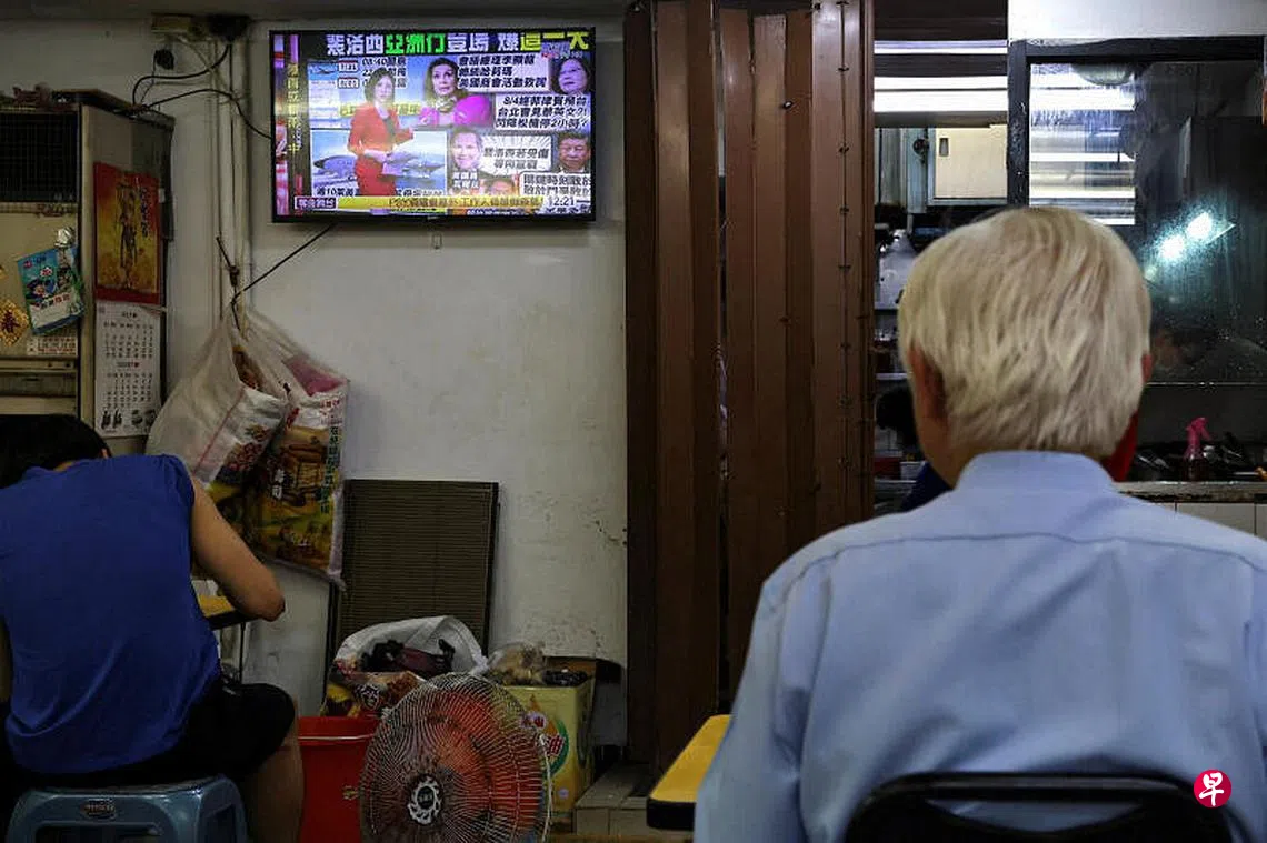 美国国会议长佩洛西的亚洲行在两岸引发关注。台北一家餐馆中,顾客边用餐边观看有关佩洛西亚洲行的新闻。(路透社)