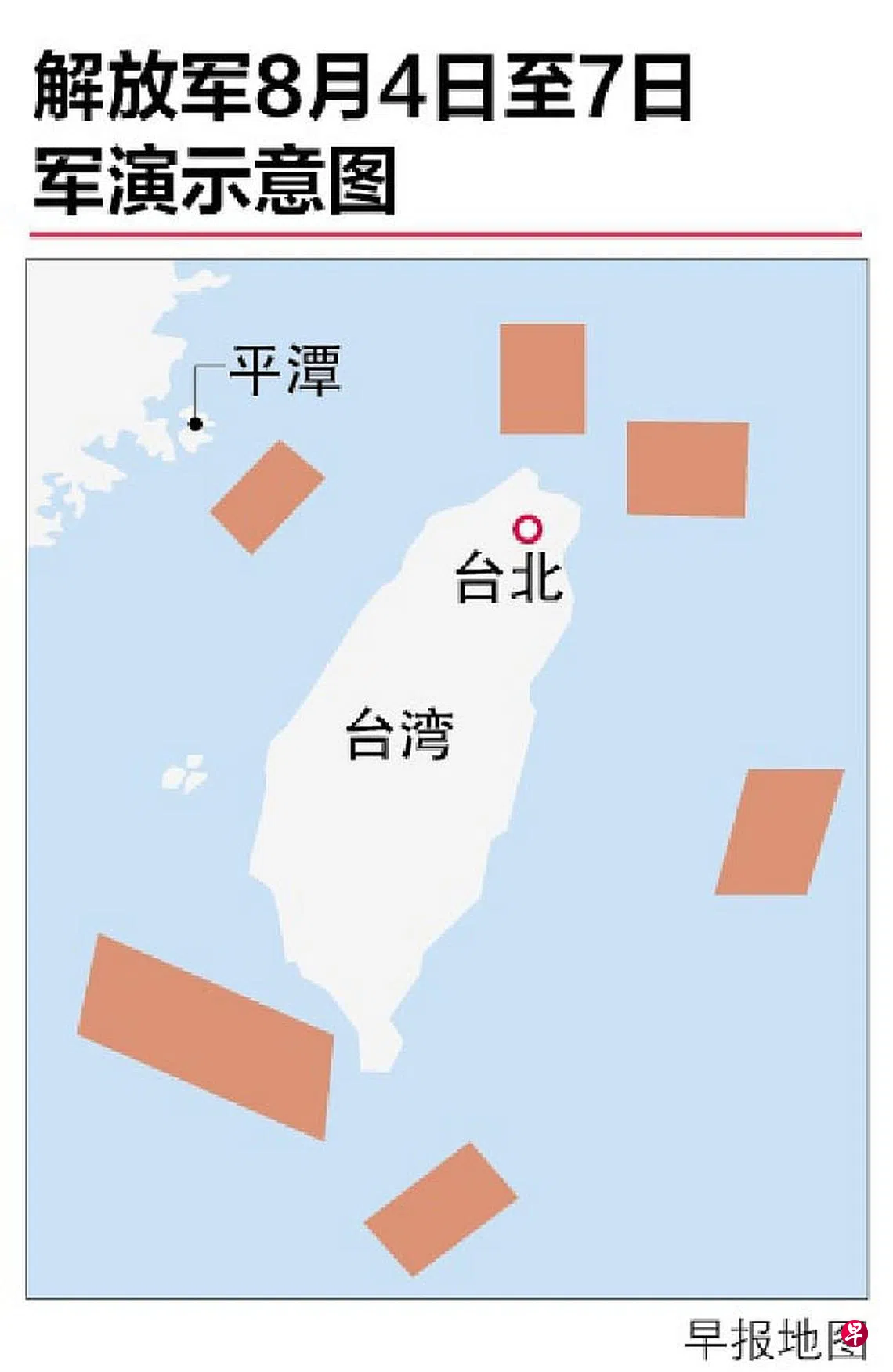 解放军也在晚上10时许宣布,从8月4日至7日,在台湾周边六个范围的海域和空域,进行重要军事演训行动,并组织实弹射击。解放军从7月29日起已在东部、南部和北部三大战区火力全开展开军演。