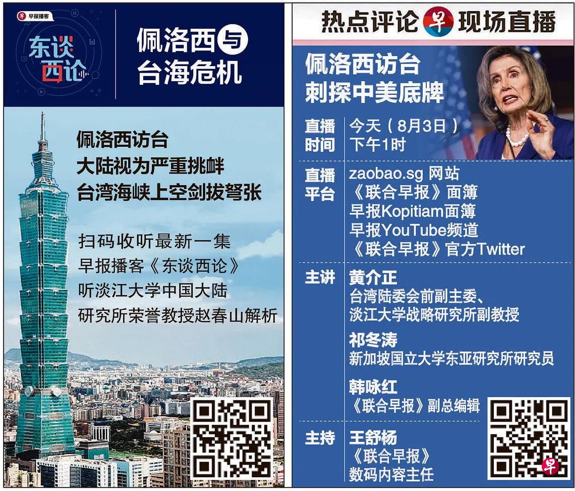 赵春山曾是马英九政府时期的两岸政策智囊,也是淡江大学中国大陆研究所荣誉教授。他在《联合早报》最新一期的国际时事播客节目《东谈西论》中指出,佩洛西今年4月因确诊冠病暂时取消访台行程,但并不意味她放弃访台。在4月以后,中美高层数月“相当不寻常”地连续举行多场高层对话,在外交、军事、经贸等领域高频度互动。