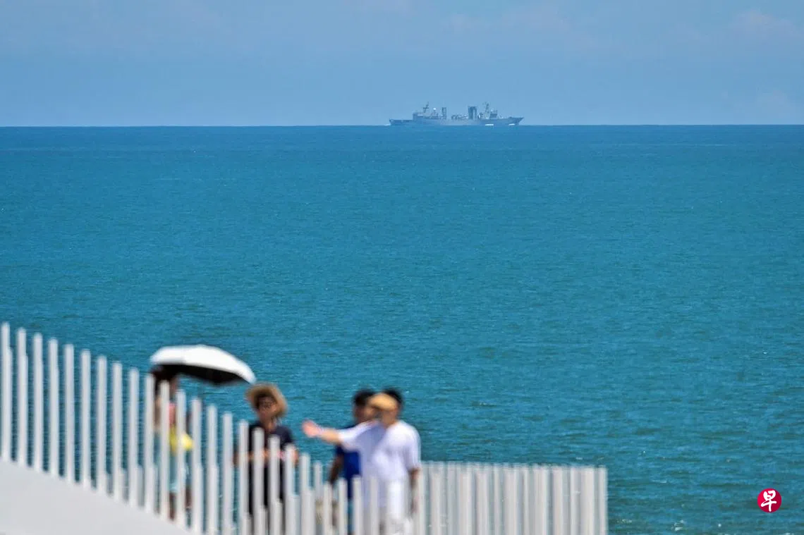 福建省平潭岛距离台湾本岛新竹最近处只有68海里(相当于125公里),号称“中国大陆距离台湾本岛最近的岛屿”。解放军连日来在台湾本岛周边海空域展开军事演训,对平潭岛上游客是难得一见的“风景线”。图为中国海军的一艘电子侦察舰,星期五出现在平潭岛岸外海上。(法新社)