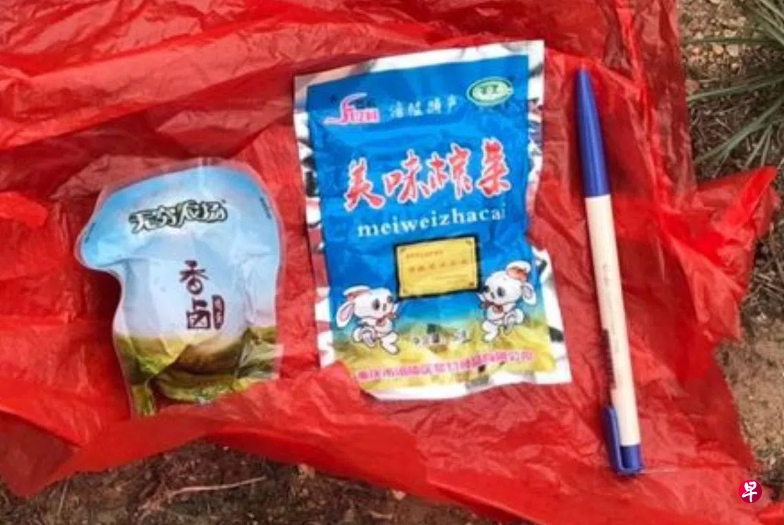 台湾军方公布的照片显示,一个红色包裹上摆放着一枚卤蛋、一袋榨菜和一支圆珠笔。卤蛋和榨菜的外包装与大陆网友“泉州机长”影片中的卤蛋和榨菜包装一致。