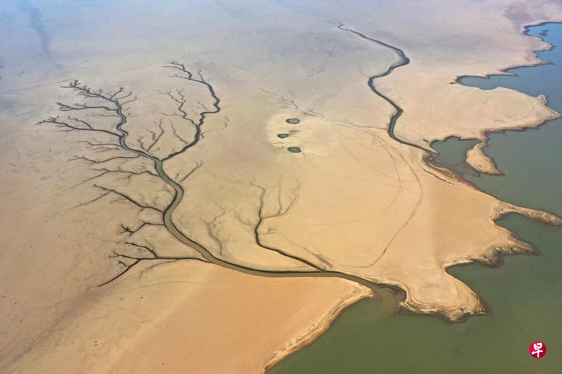 中国江西省九江市都昌县鄱阳湖水域在星期二(9月6日)大面积滩涂露出,干涸的湖床形成一个巨大的“树形图”。当日8时,鄱阳湖星子站水位退至7.99米,为1951年有记录以来历史同期最低水位,鄱阳湖进入极枯水期。2022年为有记录以来由枯水位退至极枯水位最快的年份。(中新社)