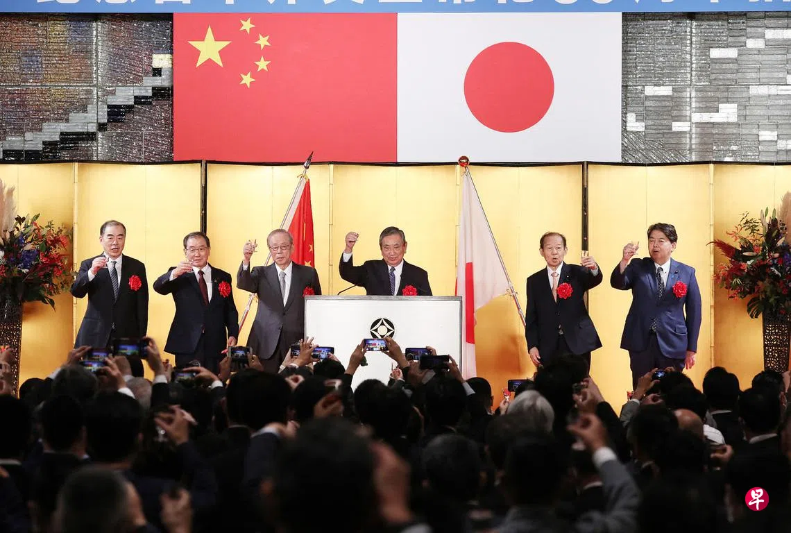 日本经济团体联合会(经团联)和日中友好团体在东京举行了纪念招待会。日方出席人士有前首相福田康夫、自民党前干事长二阶俊博,中方有驻日大使孔铉佑等人。岸田受经团联等邀请,但并未出席纪念活动。