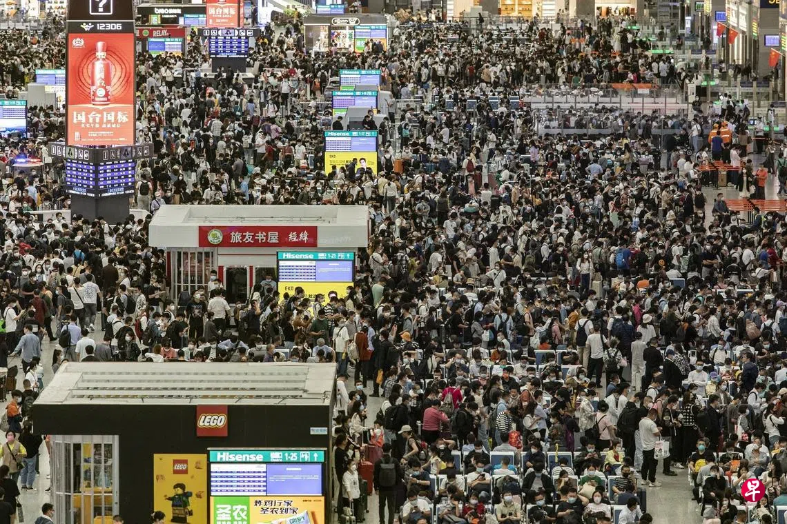 上海是今年中国国庆黄金周的旅游订单排行中的热门城市。据上海市公安局闵行公安分局虹桥火车站防疫和转运专班官员介绍,截至9月24日,9月30日和10月1日每天从上海出发的出票量已经达到了20万,上海市防疫部门要求,往返上海的旅客乘坐飞机、高铁、列车、跨省长途客运汽车、跨省客运船舶等交通工具前,必须持有48小时内核酸检测阴性证明。图为9月30日中国国庆日前夕,上海虹桥火车站候车大厅等待离沪的旅客人潮。(彭博社)