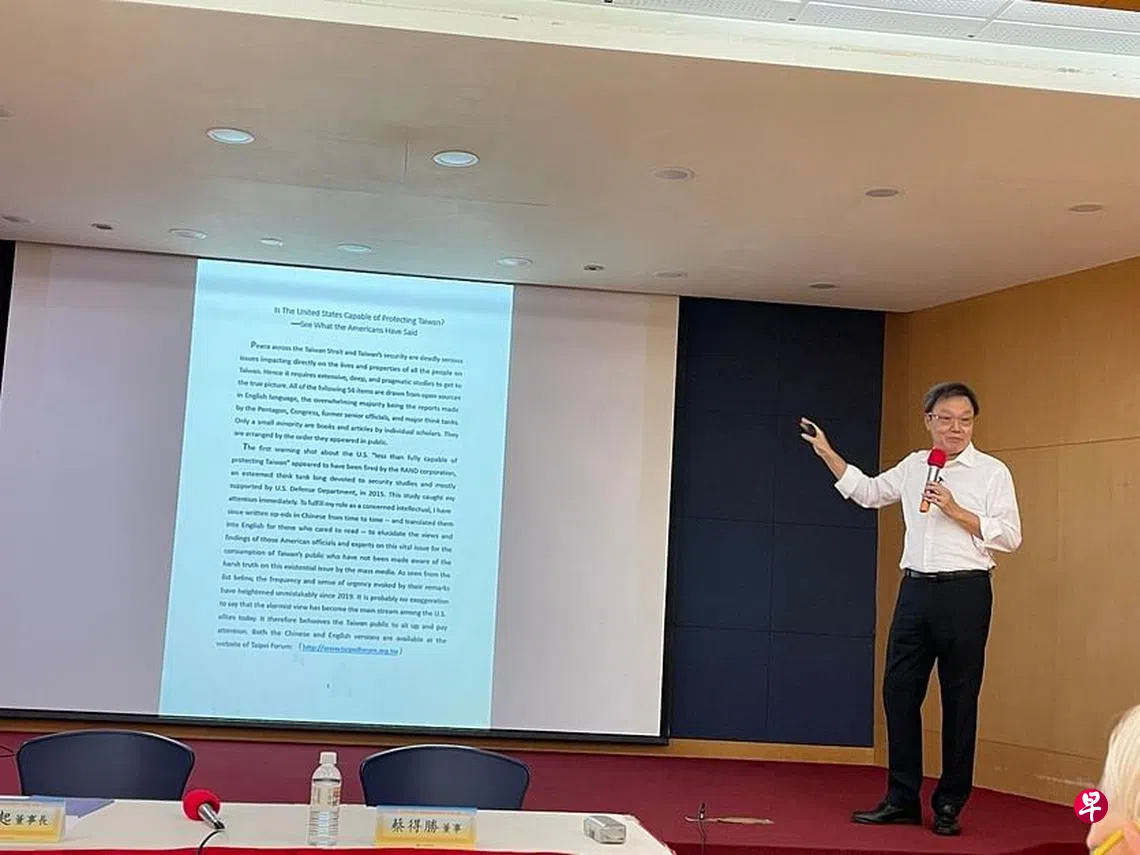 在台北论坛基金会于台大校友会馆举办的讲座上,苏起公布自2015年起迄今年9月搜集到的资料,发表“美国保台的能力究竟如何?——看美国人怎么说”演讲,现场座无虚席,包括台积电创办人张忠谋和专家学者都到场聆听。