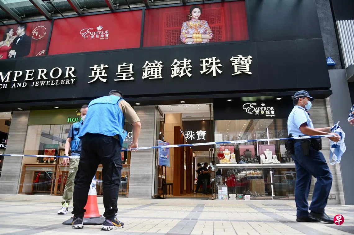 香港尖沙咀广东道一家珠宝店10月10日中午12时许发生抢劫案。两名非华裔男子假扮顾客,声称想购买价值约2000万港元(约366万新元)的翡翠项链;当职员展示项链时,其中一人拿出50厘米长的利刀恐吓店员,并抢走项链。两名男子得手后,登上一辆黑色接应私家车逃走。警方接报后,在附近进行兜截,并在油麻地发现被遗弃的私家车,在车上发现他们犯案时所带的利刀及工具。警方正通缉三名非华裔男子,年龄介乎30至40岁,身高1.7米至1.75米,其中一人是接应的司机。图为警员接报后迅速封锁现场搜证。(中新社)