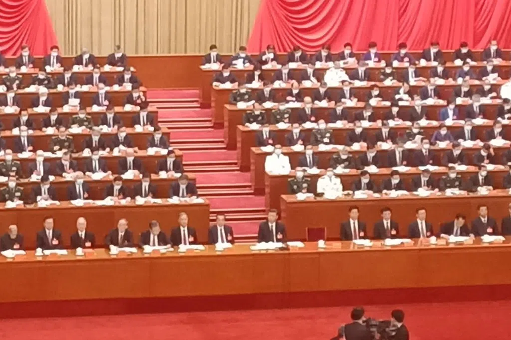 同样一头白发的温家宝,坐在现任副总理韩正的左侧。他全程笔直而坐,双手垂放身体两侧,面无表情。在大会开始后的头50分钟,温家宝只是数次轻轻翻开报告扫了几眼又翻回封面。直到习近平宣读到“加快构建新发展格局,着力推动高质量发展”时,温家宝才完全翻开报告仔细阅读内容。