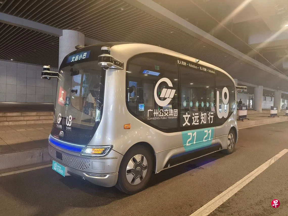 减速、避让、掉头、刹车……广州阅江路上,自动驾驶车辆在车流中行驶,平稳停靠在站台,接载乘客后,缓缓关闭车门并再次启动。