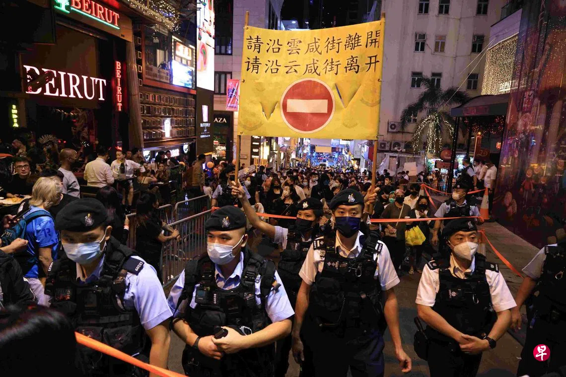 韩国首尔梨泰院星期六(29日)一场万圣节活动上发生恐怖踩踏事故,与1993年香港中环兰桂坊的经历相似,当时造成21人死63人伤,大部分死伤者为青少年,当中也有外国游客,成为香港开埠以来最多人死亡的人踩人惨剧。为了防范意外,香港警方星期天(30日)和星期一(31日)晚在兰桂坊一带,实施单向人流管制,设立紧急救援通道和救护站。图为星期一晚兰桂坊人头攒动,警方在兰桂坊实施人群管制措施,现场秩序井然。(中通社)