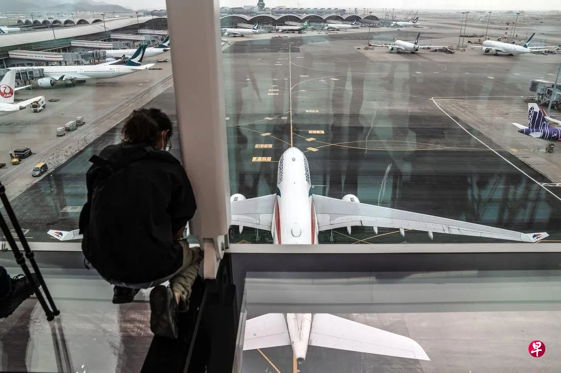 香港国际机场连接一号客运大楼与T1卫星客运廊的“天际走廊”星期二(11月1日)正式启用,该桥全长200米,净高度超过28米,可让全球最大型双层客机空客A380通过。“天际走廊”桥头尾两端分别设有餐厅及观景台,观景台装修完毕后,可让旅客远眺机场第三条跑道;桥两侧近窗位置的玻璃地板,则让旅客可看到飞机从脚下缓缓行过。图为马来西亚航空公司一架客机星期二在“天际走廊”下通过。(彭博社)