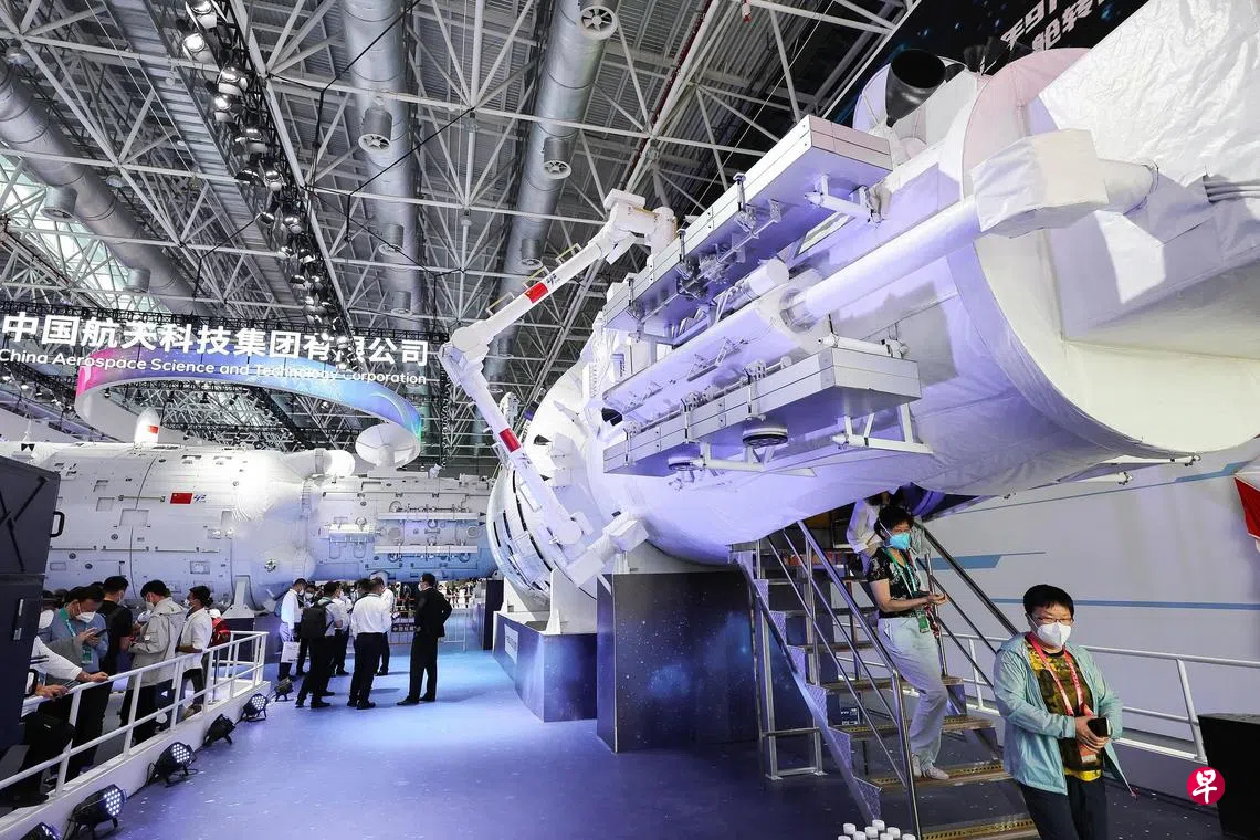 按真实比例1比1制作而成的中国空间站组合体展示舱,成为第14届中国国际航空航天博览会(珠海航展)的观众打卡点。据了解,中国空间站以“天和”核心舱、“问天”实验舱、“梦天”实验舱为基本构型,三舱呈“T”字结构分布。图为11月9日观众在珠海航展排队参观中国空间站组合体展示舱。(新华社)