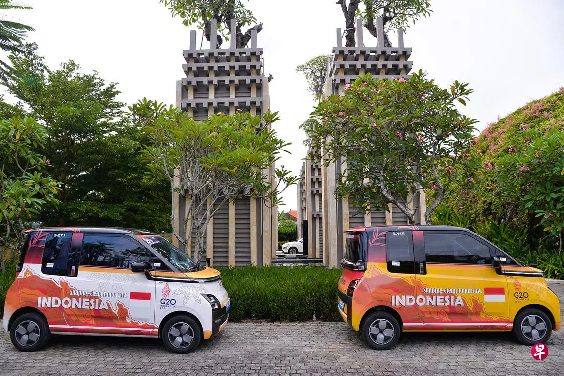 300辆由上汽通用五菱印尼公司生产的新能源车Air EV,近日穿梭于印度尼西亚二十国峰会举办地峇厘岛,作为会议的官方用车为各代表团和组委会提供日常通勤服务。五菱印尼工厂建于2015年,是最早在印尼投资建厂的中国汽车企业,也是中国目前在印尼投资最大的汽车制造基地。工厂占地60公顷,为当地创造了1万多个就业岗位。图为11月12日在峇厘岛二十国峰会主会场拍摄的五菱新能源车。(新华社)