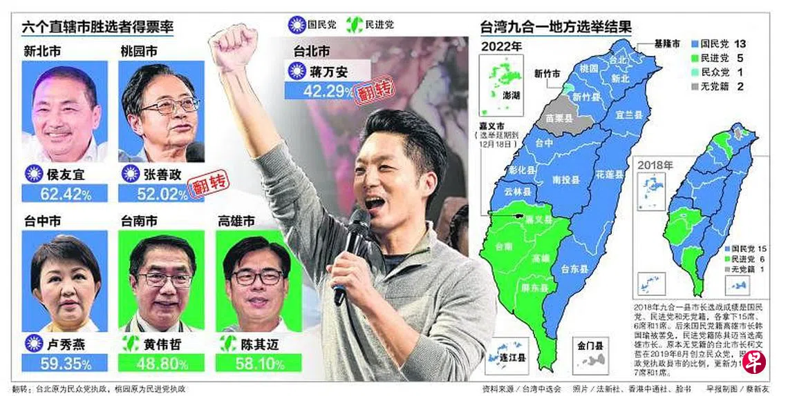 台北市长由台湾前总统蒋介石的曾孙、国民党候选人蒋万安以42.29%拿下,奠定他蓝营中生代领袖地位,政治前景瞬间看涨。