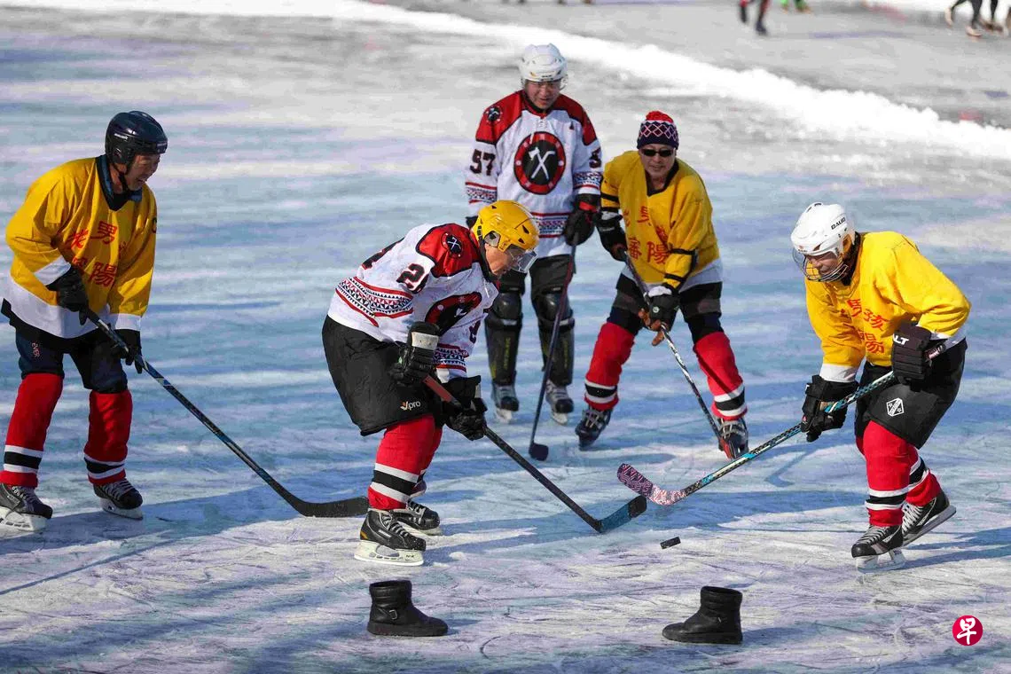 在沈阳市铁西区劳动公园的冰面上,“老男孩”冰球队激战正酣。“老男孩”冰球队在2018年成立,这是一支由平均年龄达65岁的老年人组成的业余冰球队,队员们常戏称自己是“一伙儿老顽童”。12月4日是球队开球首日,队员们早早来到冰场,换装新球衣,迎接这个冬季的首场比赛。(中新社)