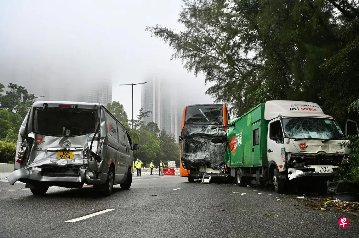 香港星期五上午9时18分发生一起致命交通事故,龙运巴士的一辆巴士、一辆货车及一辆客货车在东涌东交汇处相撞。货车司机当场身亡,客货车司机重伤送院,经抢救后不治;另有10人受伤,包括巴士乘客及清洁工人。巴士司机因涉嫌危险驾驶导致他人死亡被捕。图为三车相撞事故现场。(中新社)