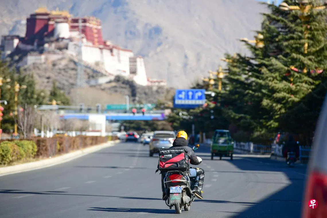 12月20日西藏拉萨一名骑手在配送外卖。(中新社)