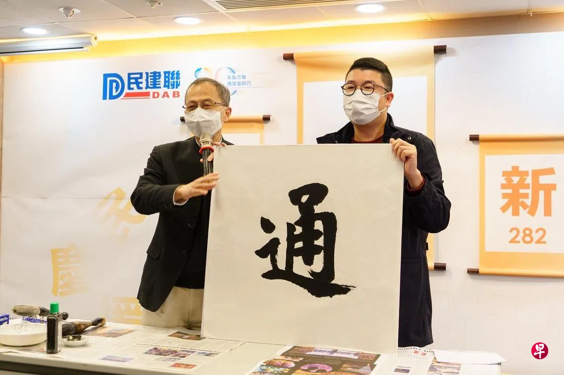 香港建制派政党民建联星期五(12月30日)公布,“通”字当选为香港今年的年度汉字,代表自冠病疫情以来,香港与大陆市民都期盼能尽快“通关”。“香港年度汉字评选2022”是民建联30周年会庆焦点活动之一。为期34天的投票期于本月22日结束,共有2749人参与投票。在团﹑民﹑青﹑守﹑创﹑庆﹑援﹑新﹑疫﹑通10个候选汉字中,“通”字以749票当选为2022年香港年度汉字。图为香港立法会前主席、民建联创党主席曾钰成(左),即席挥毫写出“通”字。(香港中通社)